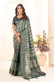 Rama Green Tussar Silk Ajrak Saree - Rama Green